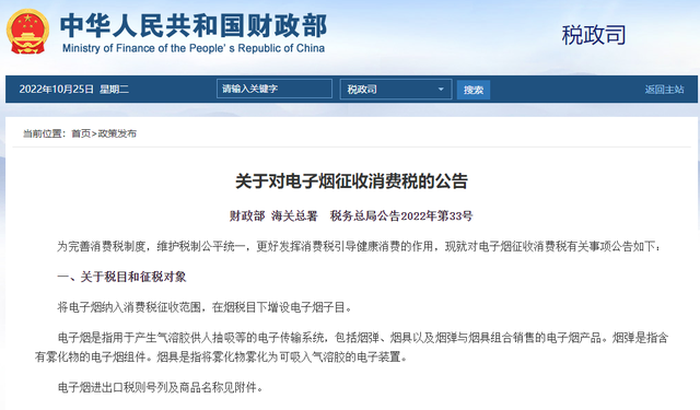 關(guān)于對(duì)電子煙征收消費(fèi)稅的公告