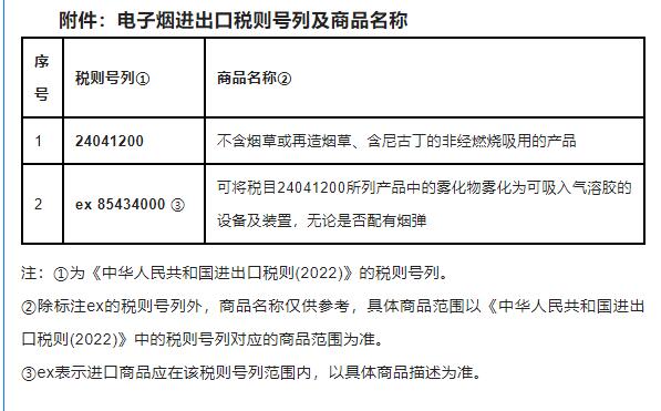 電子煙進(jìn)出口稅則號(hào)列及商品名稱見附件。